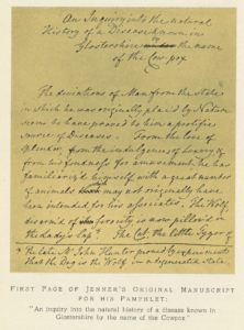 Jenner’s Case Diary “An Inquiry into the Causes and Effects of the Variolae Vaccinae; A Disease discovered in some of the Western Counties in England, particularly Gloucestershire, and known by the name of the Cowpox, 1798. Source: Burrows Welcome Collection, Public Domain