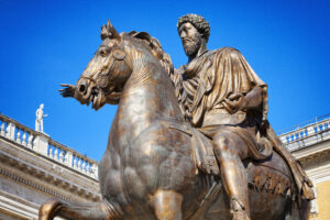 Equestrian Statue of Marcus Aurelius at Palazzo del Campidoglio in Rome, Italy. The original was erected ca. 175 AD by artist unknown, a replica made in 1981 now stands in its place. Source: iStock by Getty Images